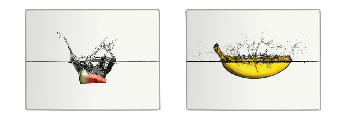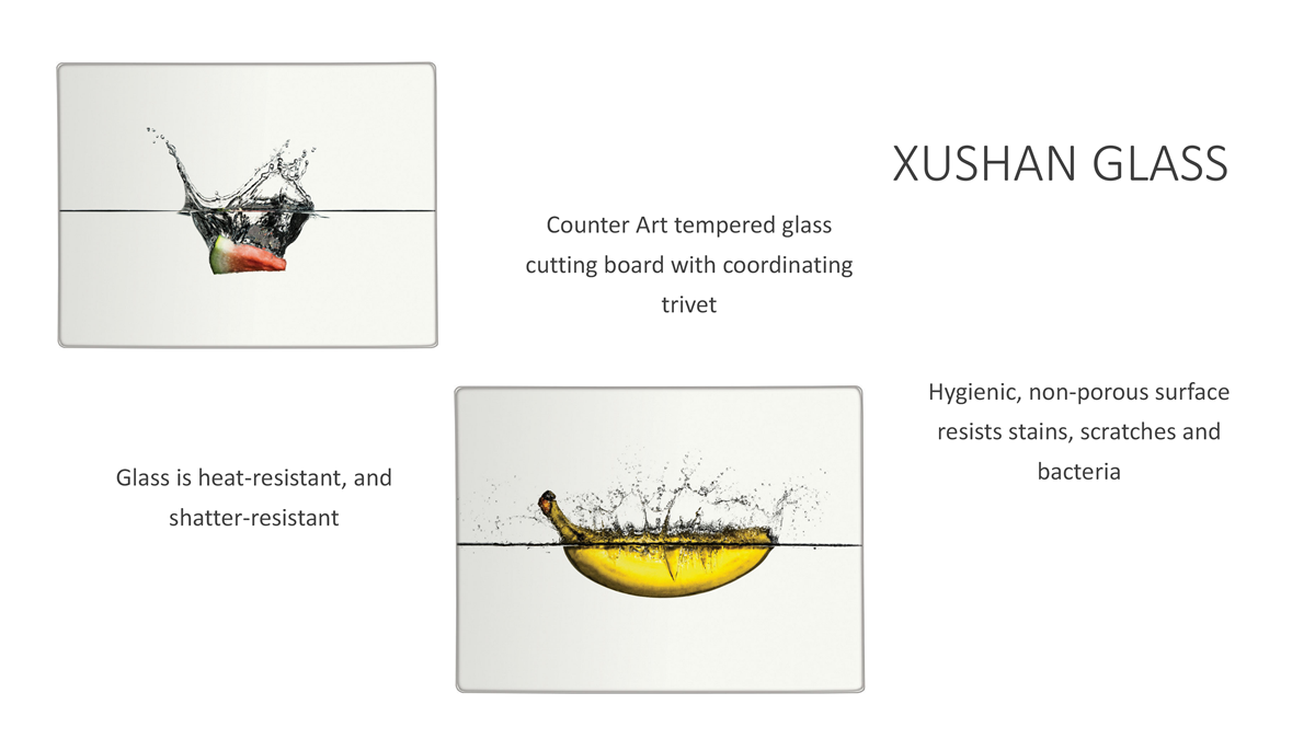 Xushan Art glass cutting board with attractive design. Hygienic, non-porous surface resists stains, scratches and bacteria. Combines colorful, artistic design with high functionality. Versatile piece great for prepping or serving. Non-skid feet on the back prevent scratches on surfaces. Dishwasher safe.