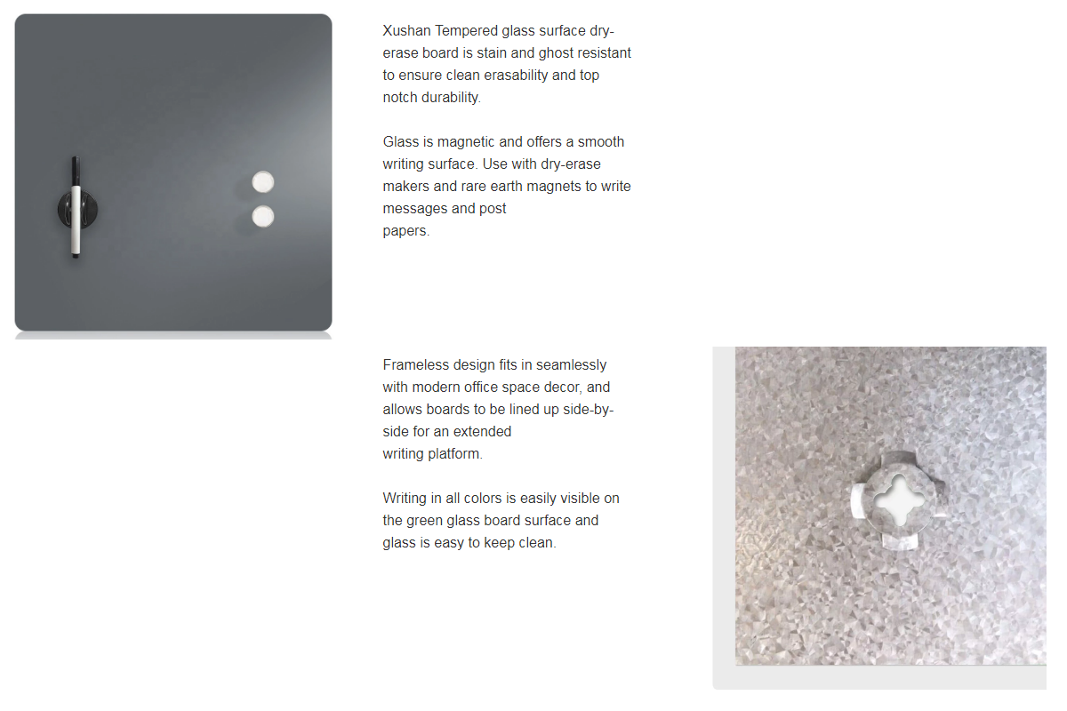 For safety, the board is made from tempered glass. The white glass dry erase board has a universal mounting system, as it can be hung vertically or horizontally to fit your allocated space. All wall hanging hardware is hidden under the mounting bolts for a sleek and modern appearance. Mounting hardware and instructions are included for quick and easy mounting. The glass writing surface is suitable for regular whiteboard markers and is easily dry erasable. The whiteboard board is also magnetic, allowing you to attach documents to the whiteboard with magnets.